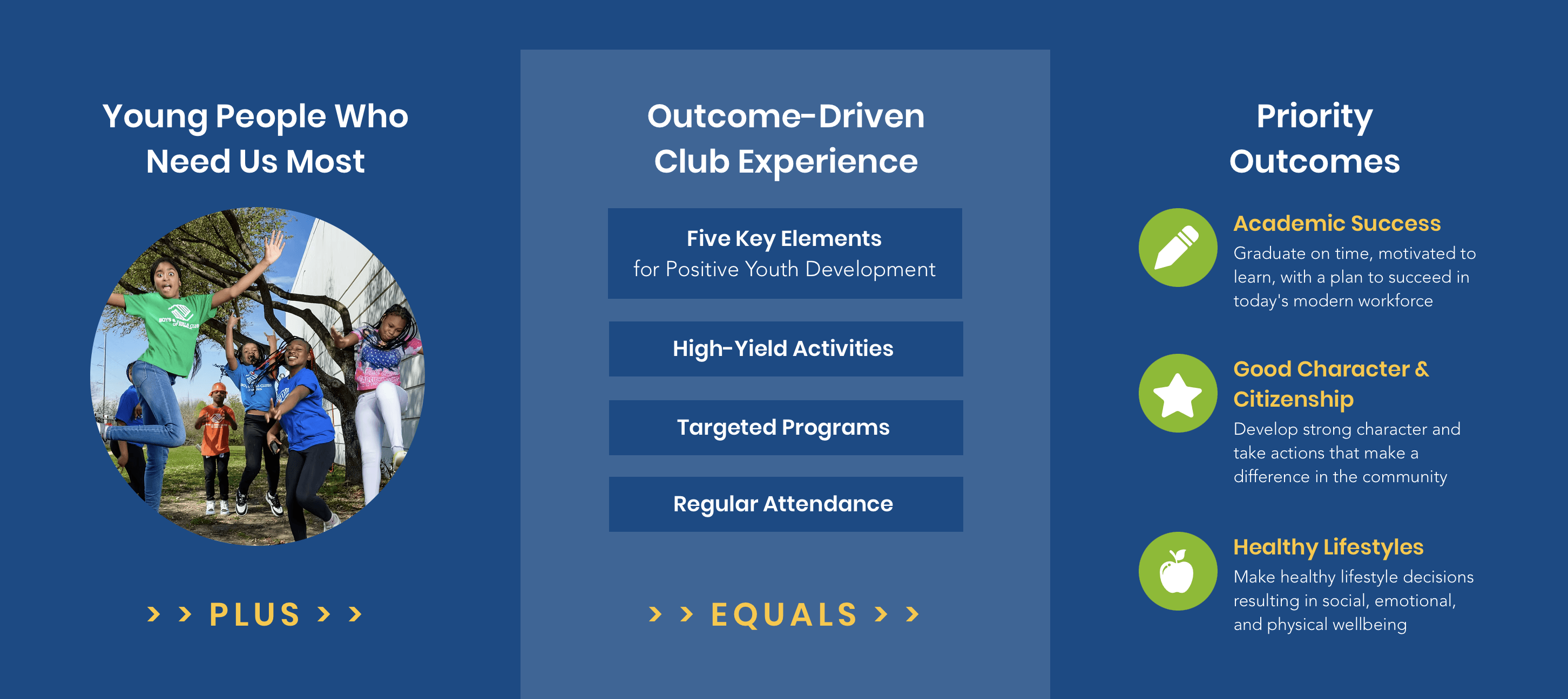 Boys & Girls Club programs are designed to encourage Club members to realize a wide variety of positive outcomes, a strategy for developing the “whole child.” They follow the Formula for Impact – our roadmap for ensuring that young people have a positive, impactful Club Experience and, ultimately, achieve the important outcomes that lead them to Great Futures.